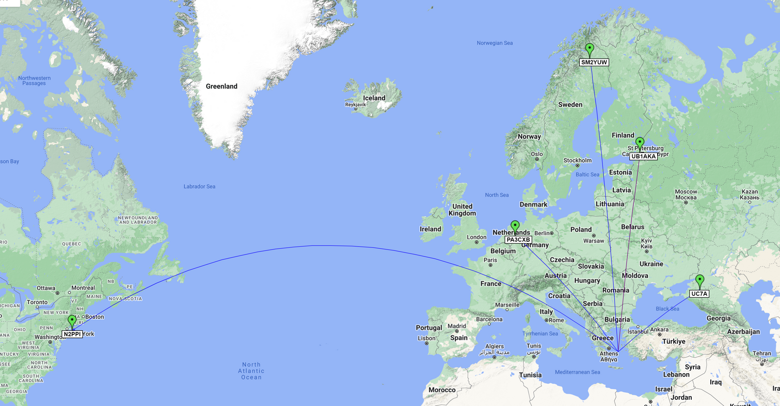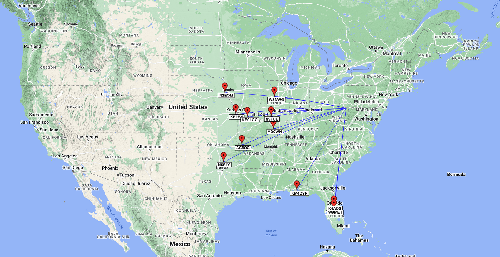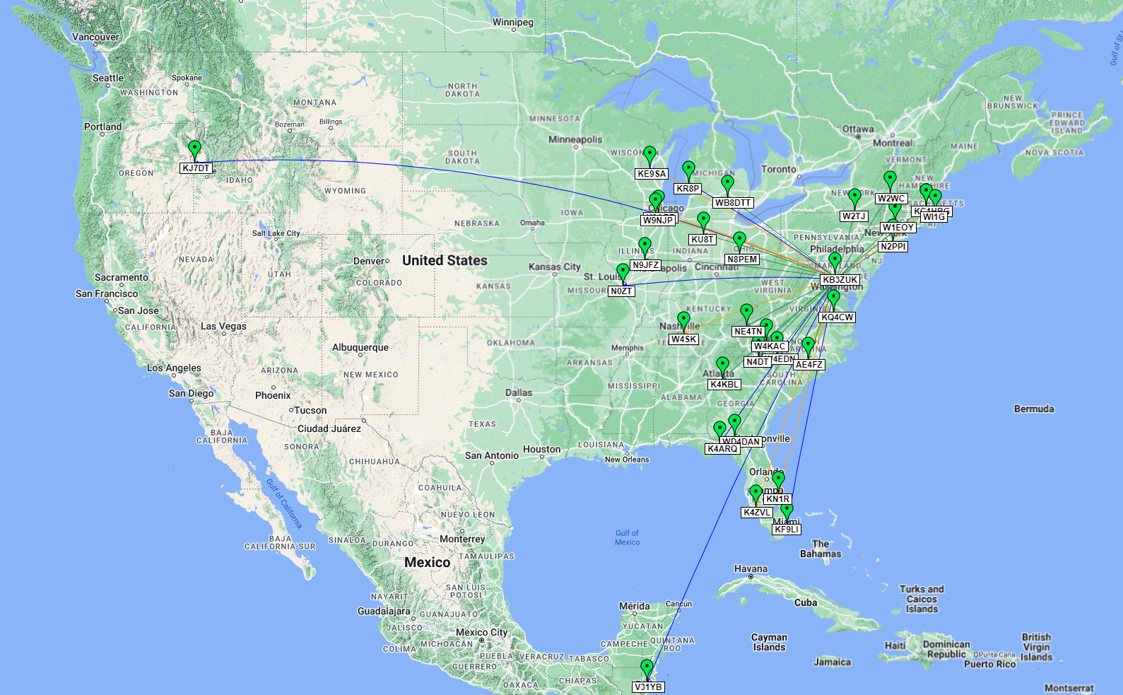 Activation QSO Map: Green Pins = CW / Green Lines = 40m, Orange Lines = 30m, Blue Lines = 20m