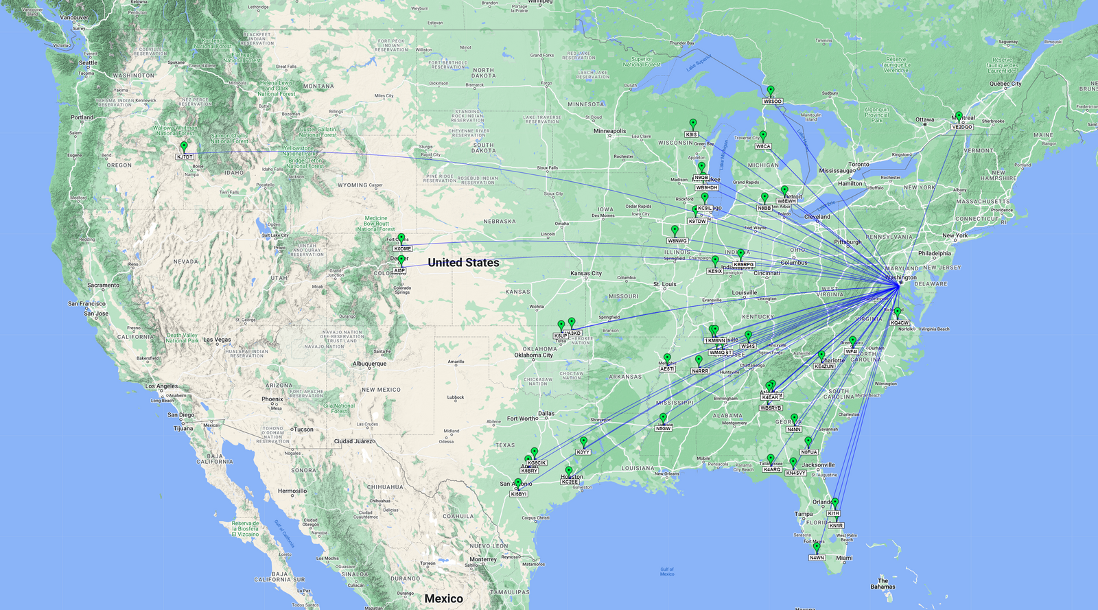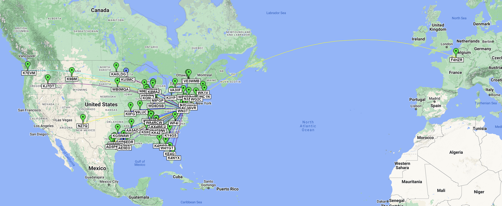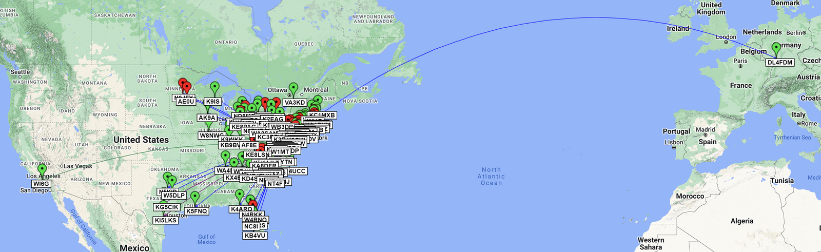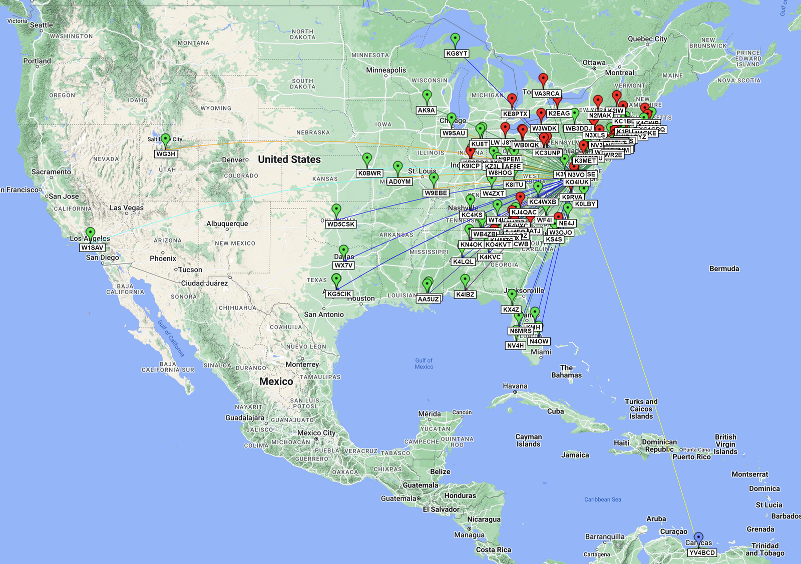 Activation QSO Map: Green Pins = CW / Green Lines = 40m, Orange Lines = 30m, Blue Lines = 20m