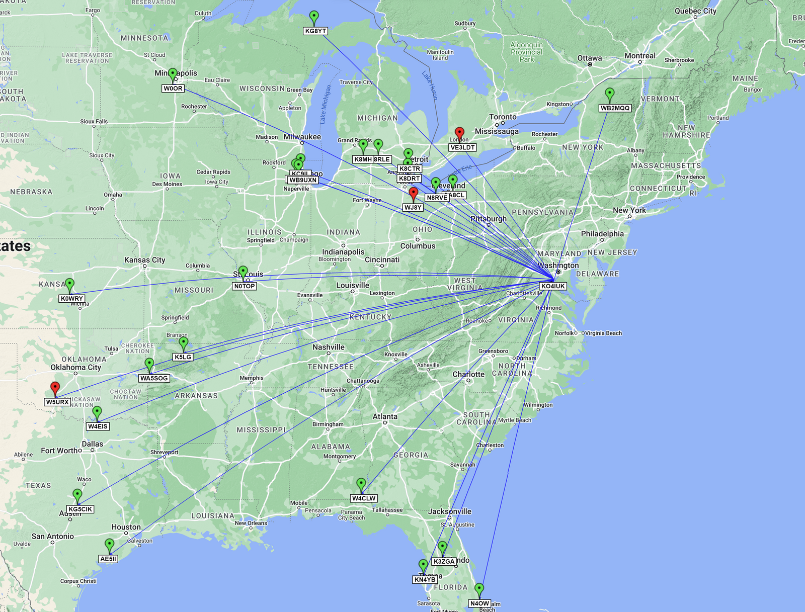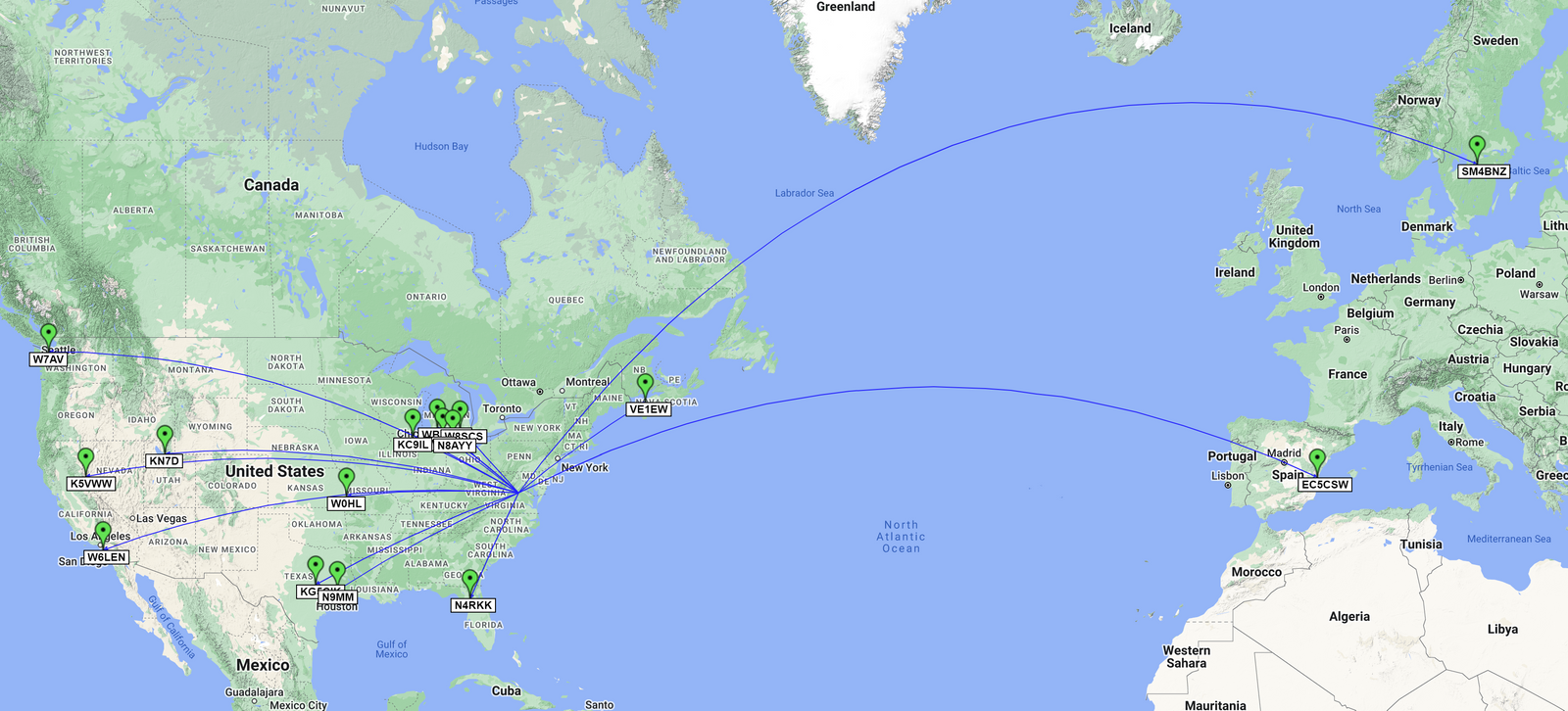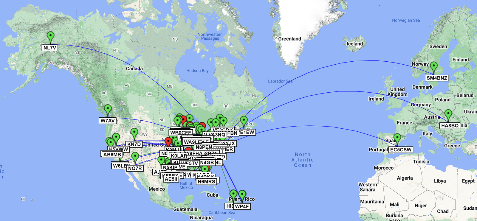 I started calling CQ and so quickly did I hear a response, they must have beat the RBN to the punch, I heard a US station operating in the Dominican Republic (that pin didn’t show up on the QSO map below, but imagine a blue line down there all the same). I had a bit of a challenge getting his HI7/ prefix on his call, but he was quite patient. That would be my only DX of the day, very fun. Next I got calls from Alabama, Florida, Georgia, Arkansas, Michigan, Virginia, and Florida again. I had a bit of a pause in the calls, looked at my car’s clock, and realized it was time to call QRT and head into the office. Another 2 activations in the books.