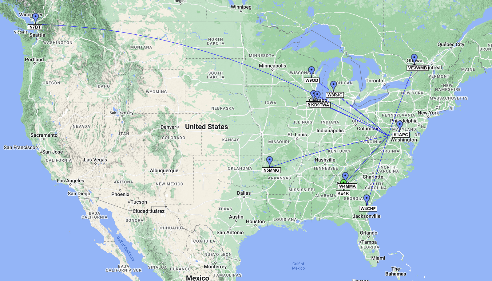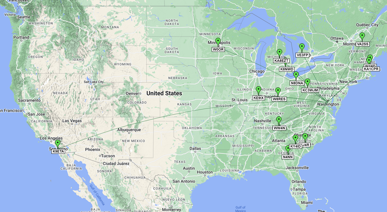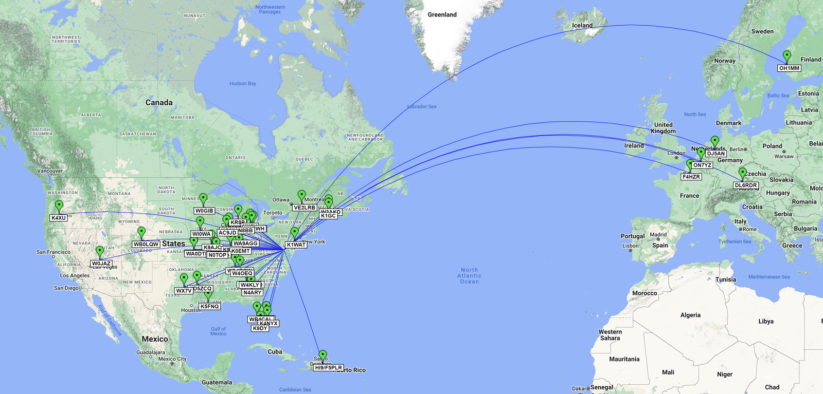 I started calling CQ and so quickly did I hear a response, they must have beat the RBN to the punch, I heard a US station operating in the Dominican Republic (that pin didn’t show up on the QSO map below, but imagine a blue line down there all the same). I had a bit of a challenge getting his HI7/ prefix on his call, but he was quite patient. That would be my only DX of the day, very fun. Next I got calls from Alabama, Florida, Georgia, Arkansas, Michigan, Virginia, and Florida again. I had a bit of a pause in the calls, looked at my car’s clock, and realized it was time to call QRT and head into the office. Another 2 activations in the books.