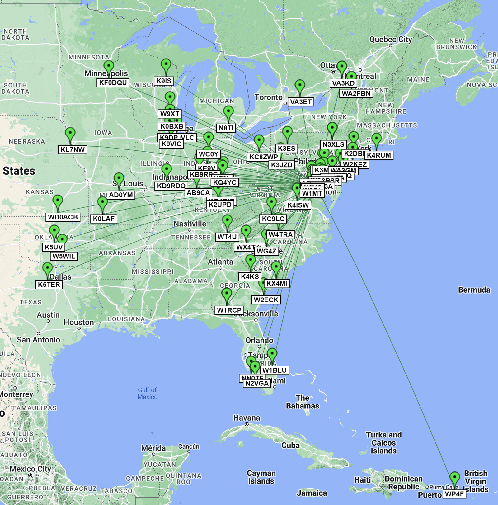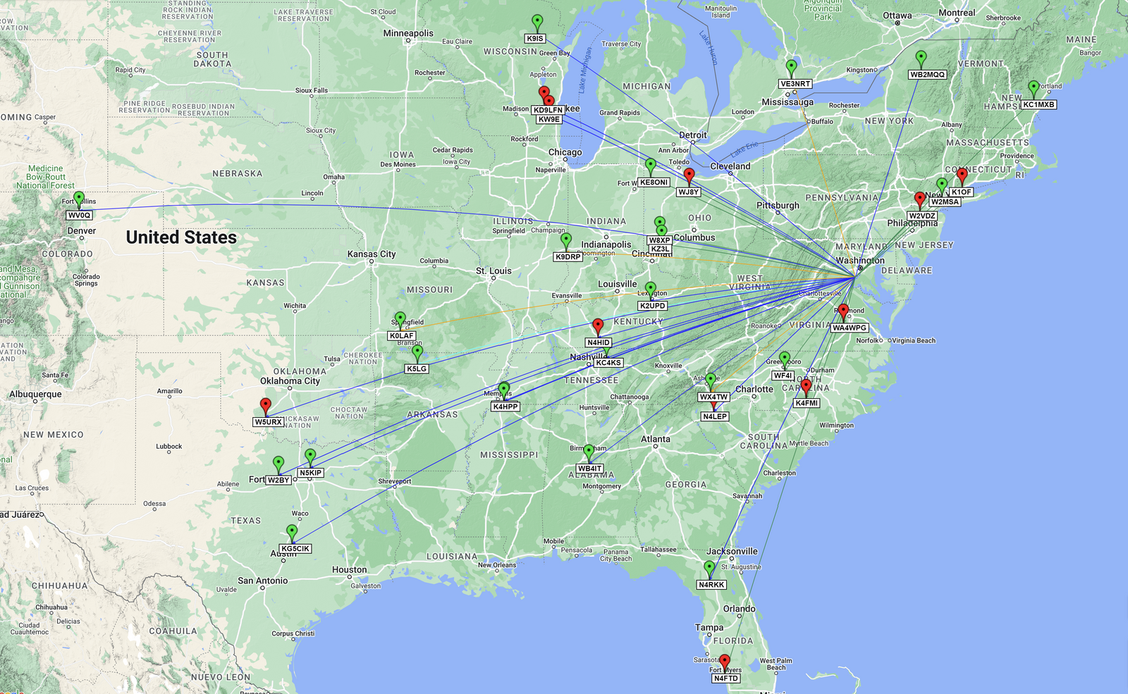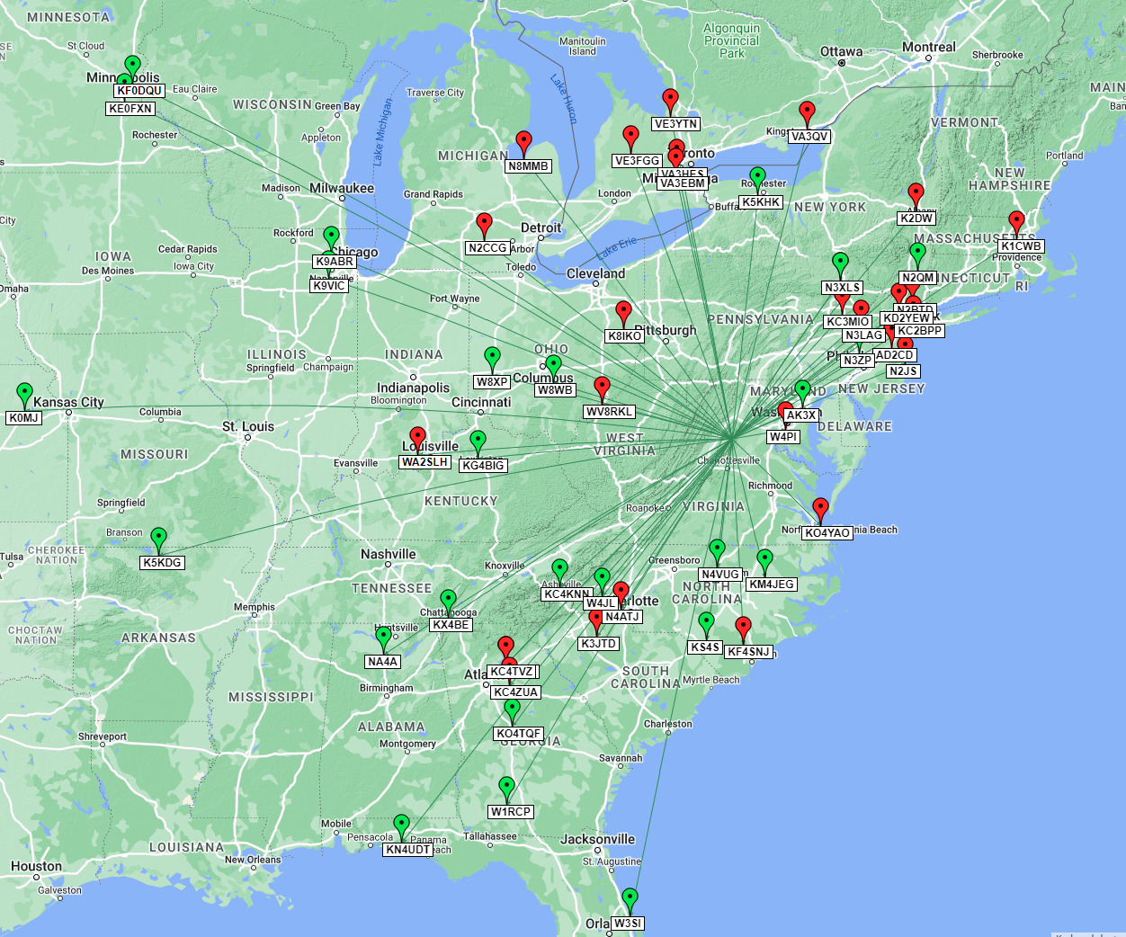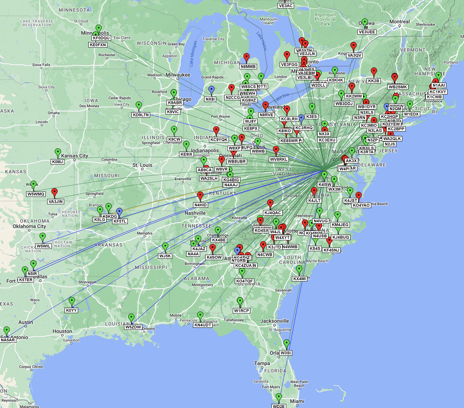 Activation QSO Map: Red Pins = SSB, Green Pins = CW / Green Lines = 40m, Orange Lines = 30m, Blue Lines = 20m, Cyan Lines = 15m