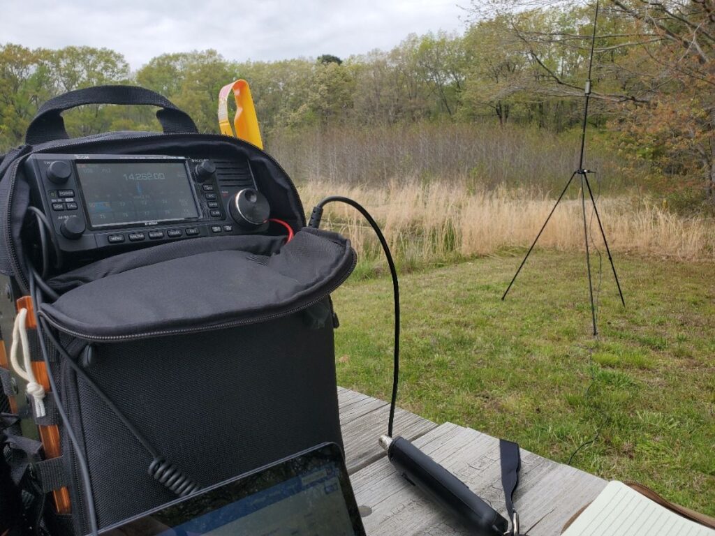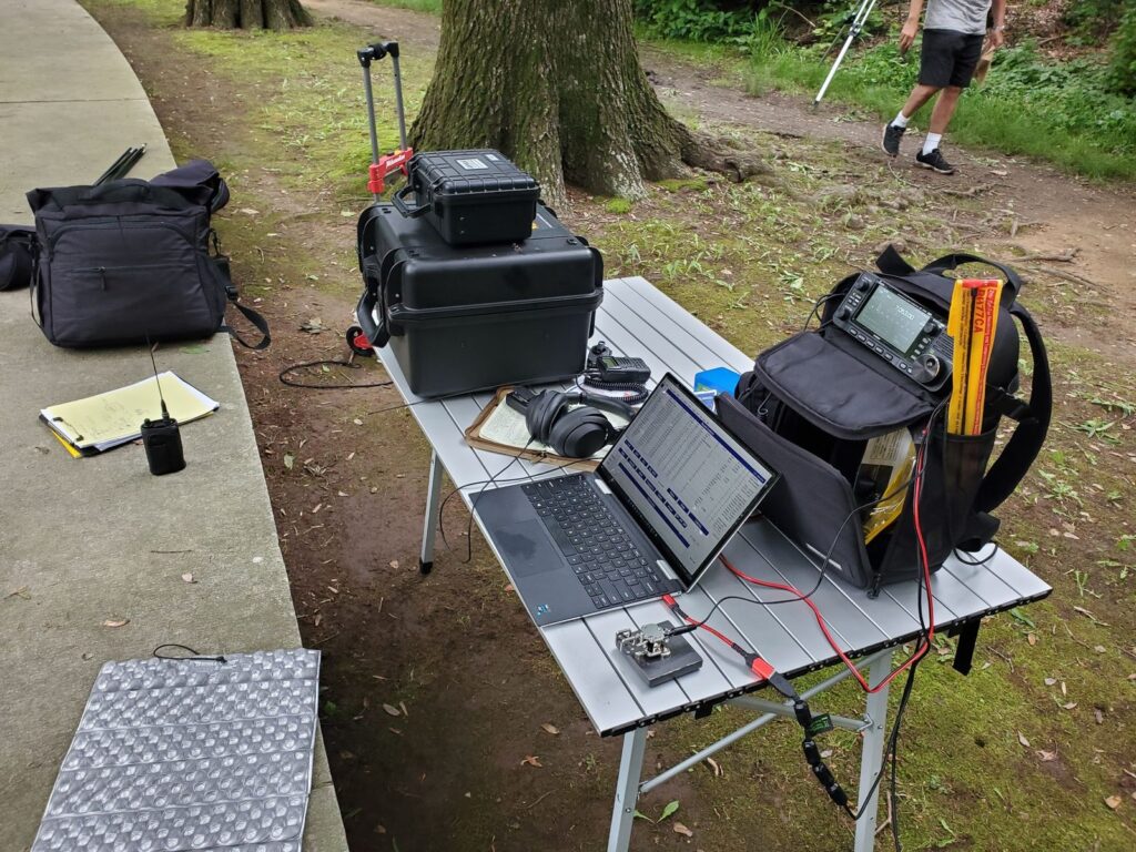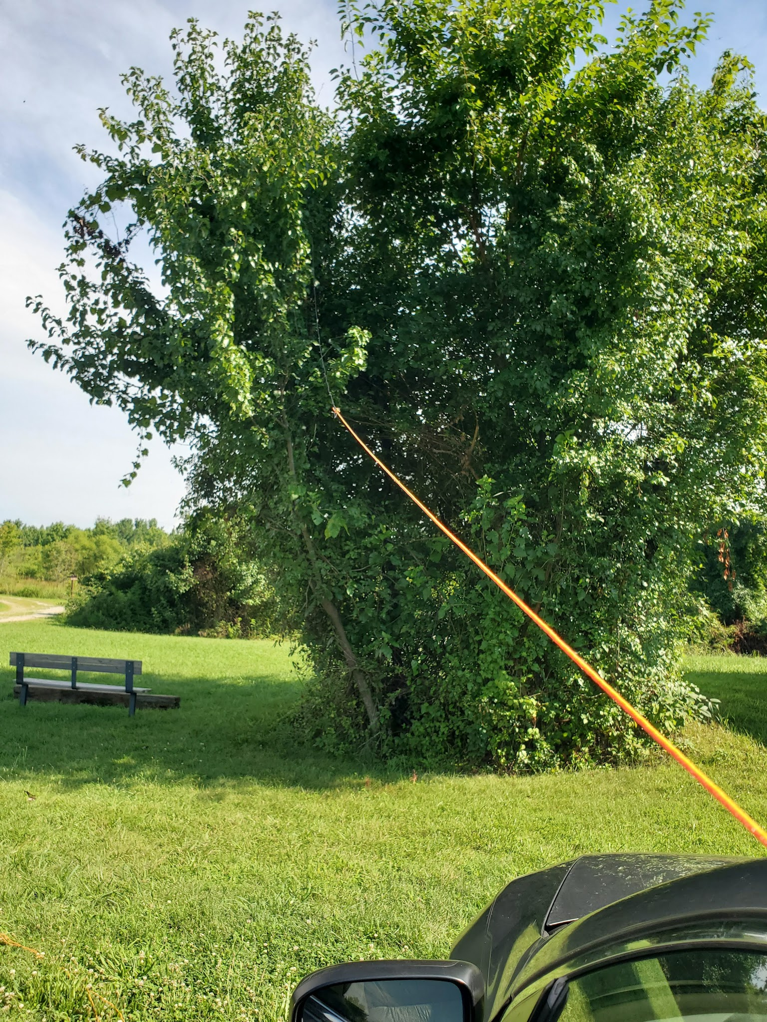 I assembled my table in front of a bench behind a tree so that I would not be in anyone’s way and used my arborist throw line to get my end fed half wave up and over the top of the tree. I was actually able to tie off the end of the line to my antenna to my car, which was quite convenient. Using that trick the line was out of the way of other visitors and I was able to get a nice slope on the antenna.