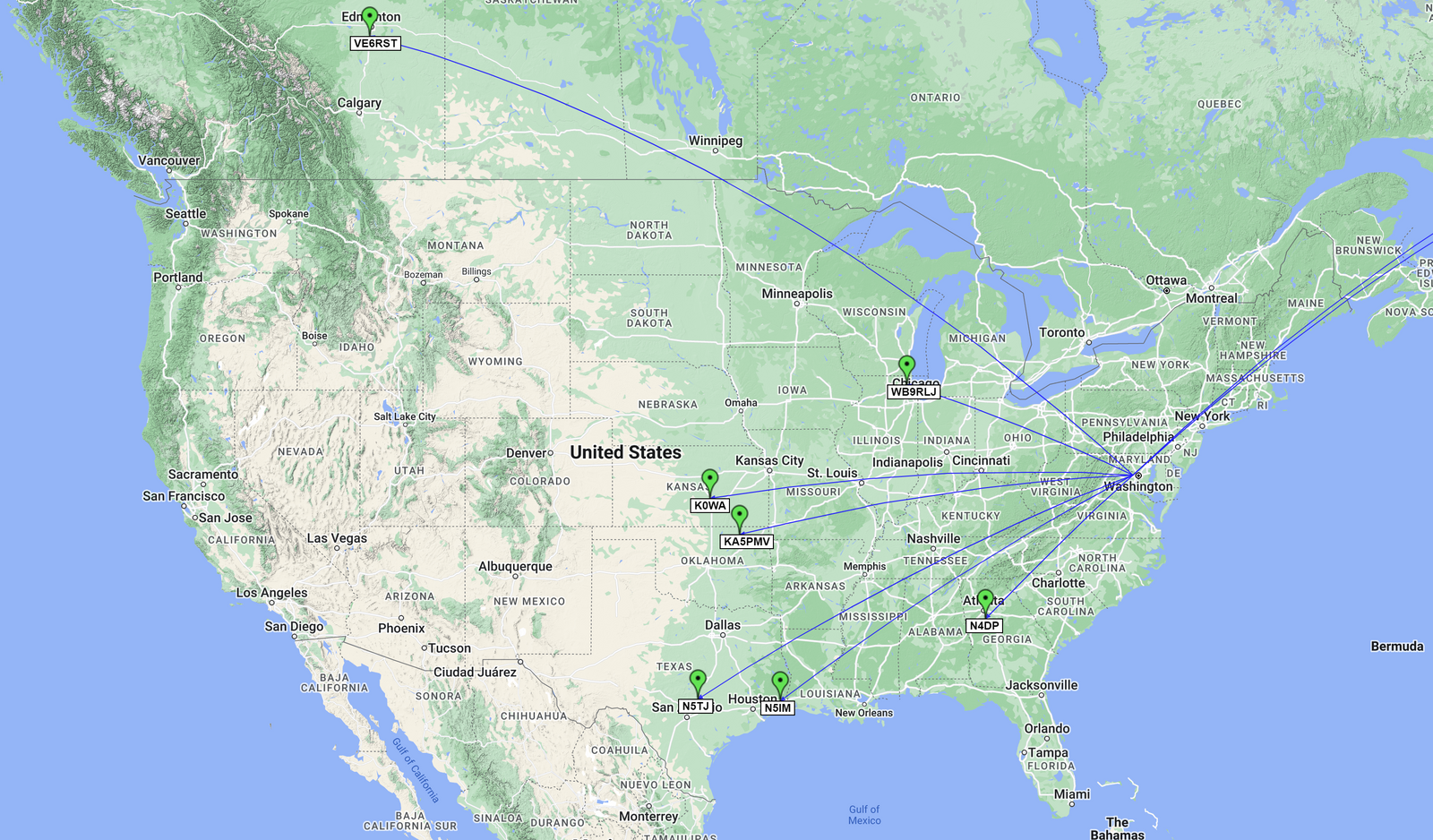 Domestic Activation QSO Map: Green Pins = CW / Blue Lines = 20m