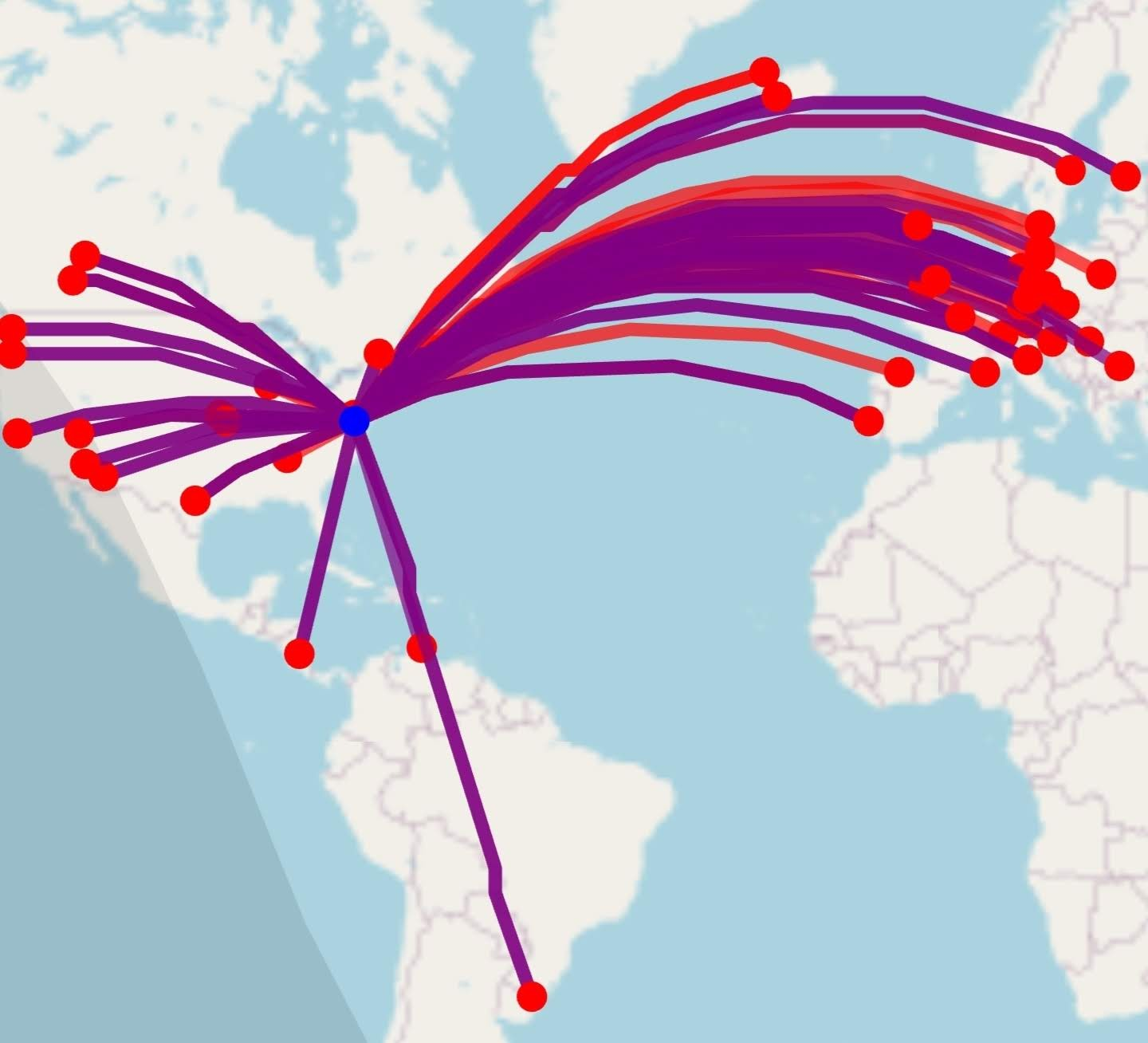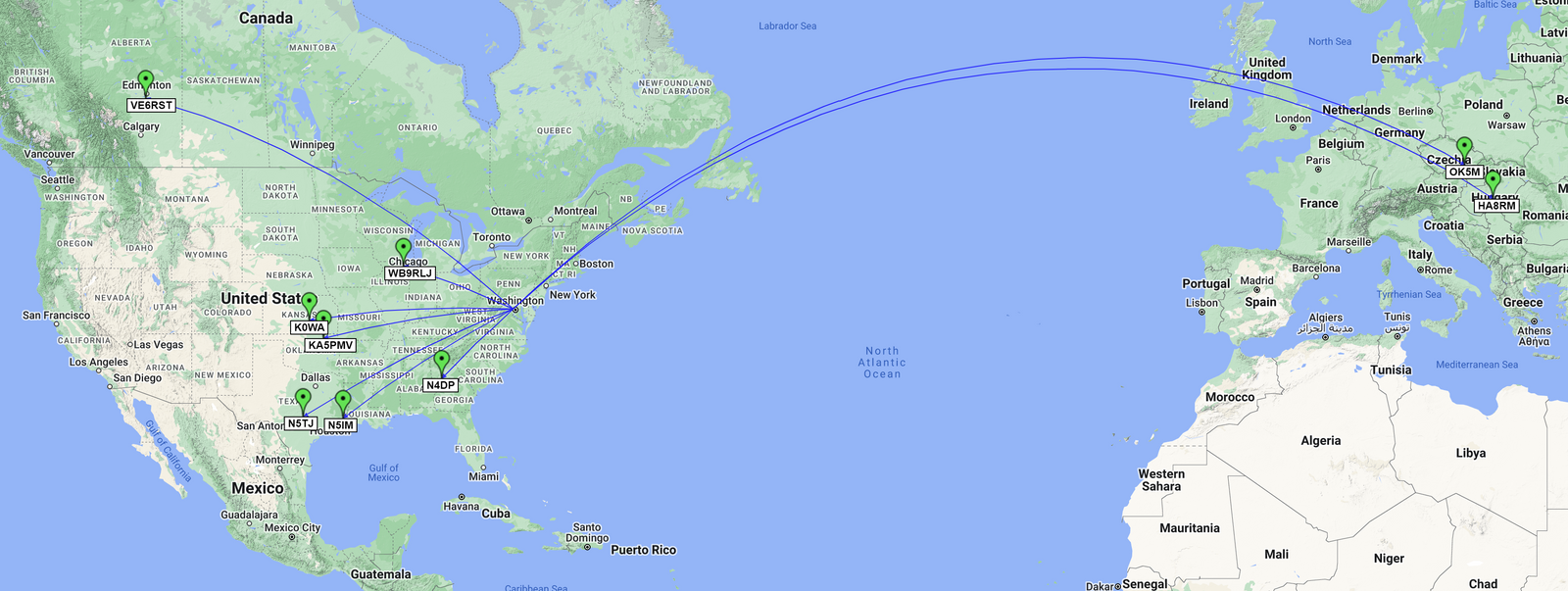 International Activation QSO Map: Green Pins = CW / Blue Lines = 20m