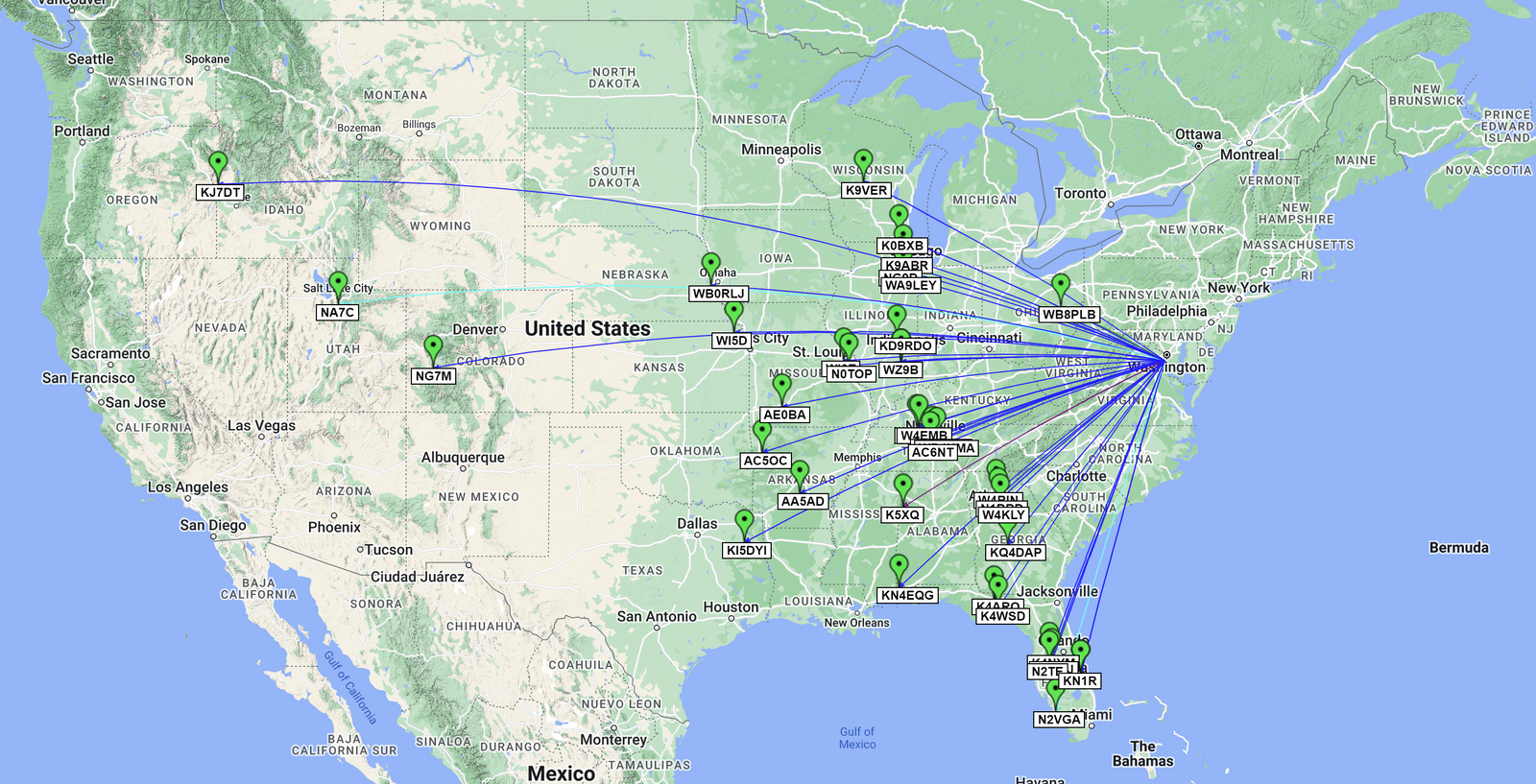 I went back to calling CQ and heard from Florida, then got a second call from Ed, W4EMB, this time from his house also in Tennessee. After a quick chat telling him I was testing a new rig, I heard from Florida again, Wisconsin, Tennessee, Florida, Illinois, Florida, Illinois, and then my longest distance contact of the day with super hunter KJ7DT in Idaho (who heard me surprisingly well). Next up was Missouri, Tennessee, Illinois, Missouri, and finally Georgia.
