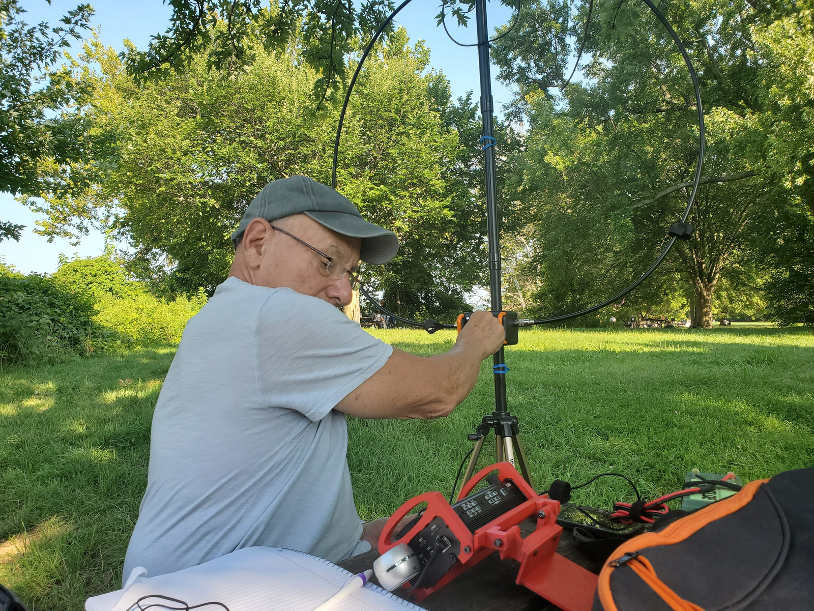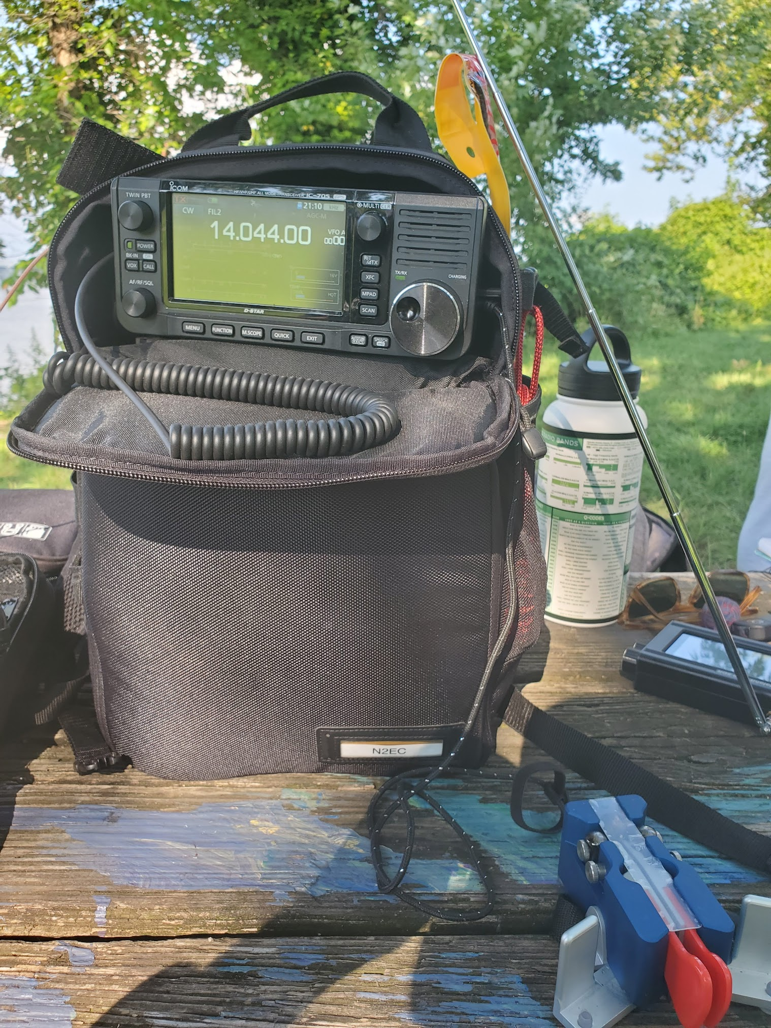 Gersohn was using his Xiegu X6100 along with his AlexLoop Magnetic Loop antenna and had setup right by the Potomac in a nice shady spot. After I rolled in I brought my Icom IC-705 and Chelegance MC-750 antenna and as I was setting up I decided to try to activate using the internal battery alone on the 705, something I had never tried before. Using the internal battery (the same ones that Icom HTs use) you’re limited to 5W output on transmit, usually I do 10 with the 705. I knew this might be a challenge, as earlier in the day solar activity had caused a lot of D-Layer absorption in the ionosphere, so conditions were a bit challenging. But, as ever, when you’re doing Parks on the Air as an activator, you are the DX. So I decided to give it the old college try.