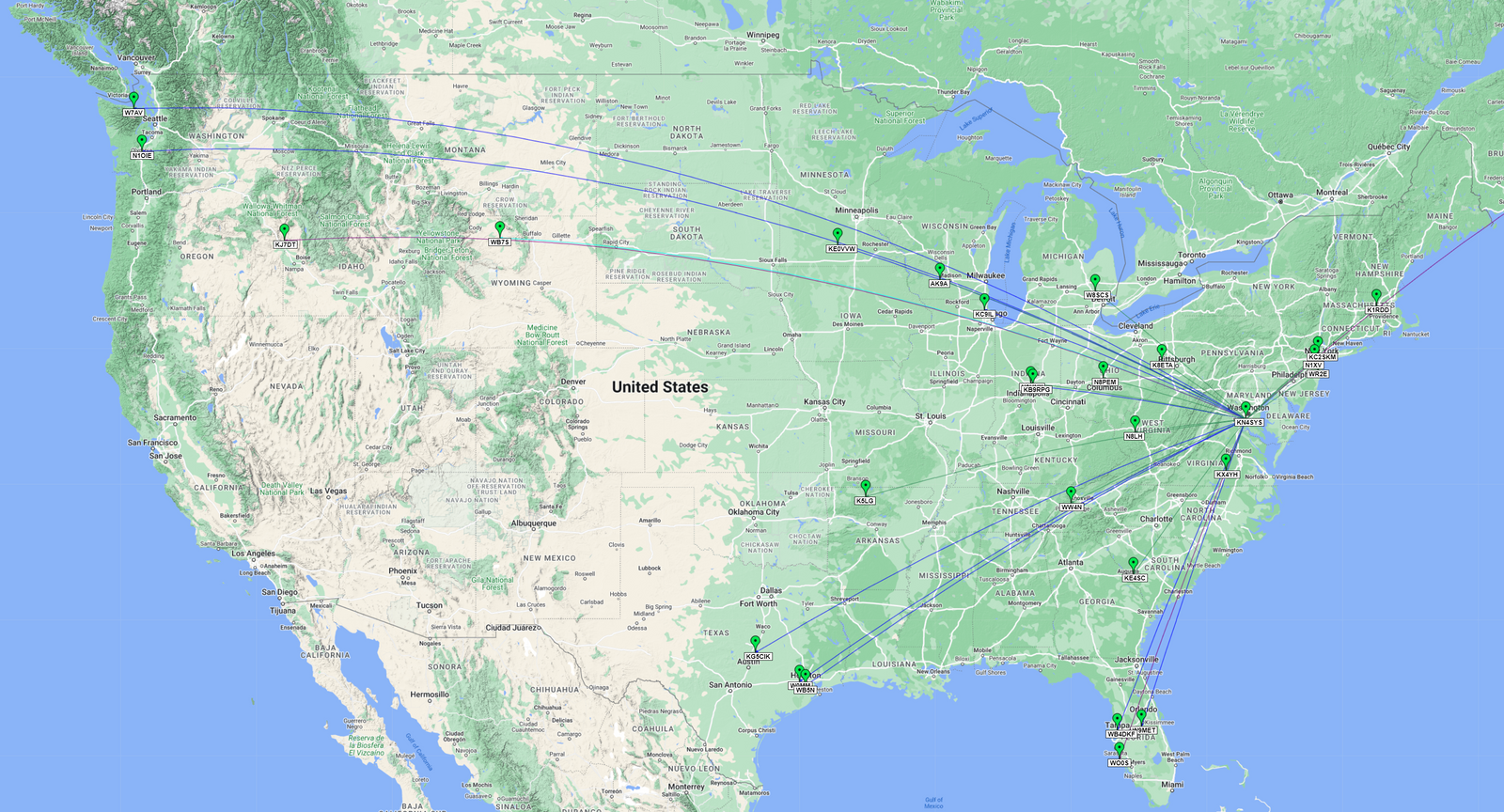 Domestic Activation QSO Map: Green Pins = CW / Green Lines = 40m, Blue Lines = 20m, Purple Lines = 17m, Cyan = 15m