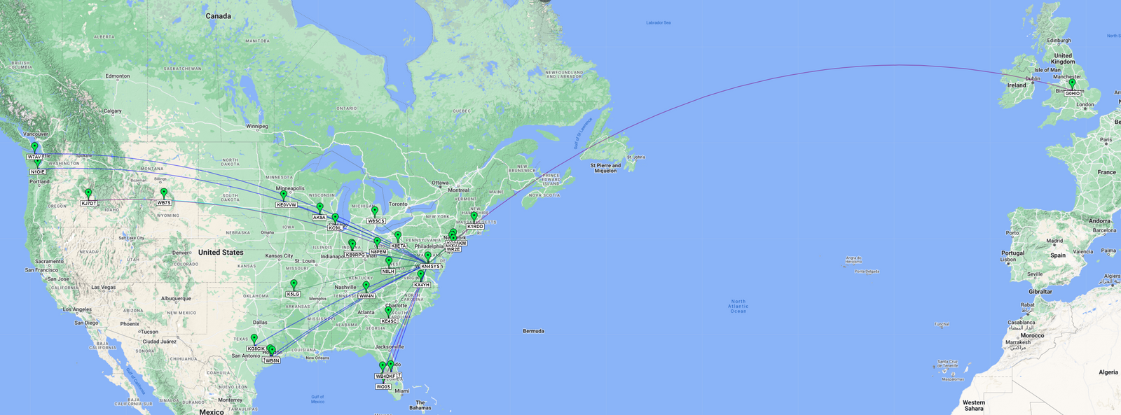 International Activation QSO Map: Green Pins = CW / Green Lines = 40m, Blue Lines = 20m, Purple Lines = 17m, Cyan = 15m