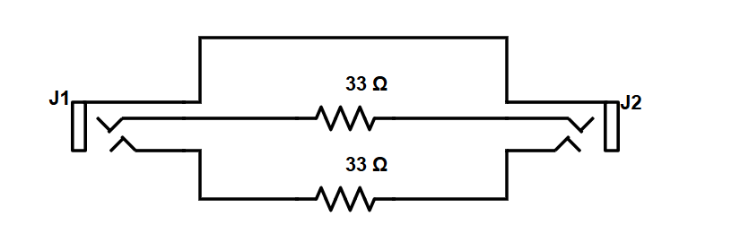 As mentioned, the circuit could not be simpler. The box has two stereo 1/8 inch (3.5 mm) jacks on either side connected to a bit of perfboard with the tip and ring connections connected through separate 33 ohm resistors that I had in my supply. The ground lead is just directly connected through between the sleeves of each connector.