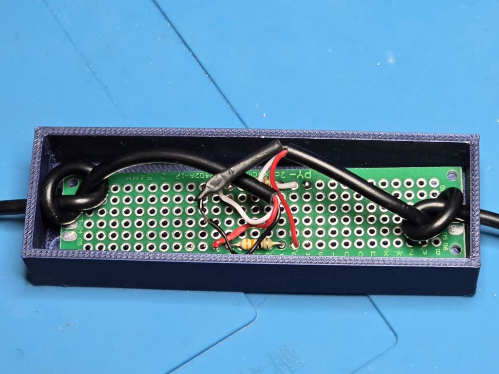 I had some perfboard from Elegoo lying around that I had picked up for another project from Amazon while back, the resistors were also on hand, as were a couple of 1/8 inch (3.5 mm) stereo jack cables I had supplied for another project, so I didn’t need any parts. All I needed was a box to put it all in, so I went into Fusion 360 and designed an enclosure to house the board and provide holes for the cables to enter and exit. A quick print in PETG with my Bambu Labs X1 Carbon later, I had the box and was ready for assembly. After soldering the connections as per the schematic and tying a loop in the cables to provide strain relief for the cable and connections, I closed up the snap-fit case I designed for it, complete with my call sign and the name of the device and gave it a test.